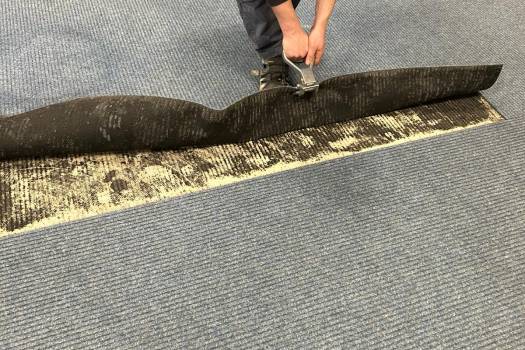 Díky pokládce kobercových čtverců jsme mohli využít výhodu možnosti postupného provedení změn po jednotlivých úsecích provozovny. Celý proces začal stržením starého koberce, který byl celoplošně přilepen. To nám odhalilo, kolik nečistot se v průběhu let pod koberec dostalo. Po důkladném odsátí nečistot a odstranění zbytků lepidla jsme přistoupili k přebroušení povrchu, opravě rozpadlé nivelační stěrky, k napenetrování podkladu, aplikace fixačního lepidla a nakonec samotné pokládce kobercových čtverců.