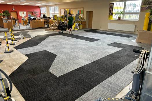 Proměna prodejních prostor - výměna starého koberce za moderní kobercové čtverce