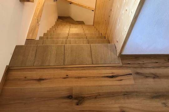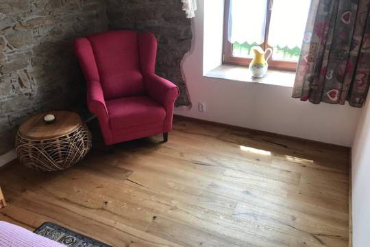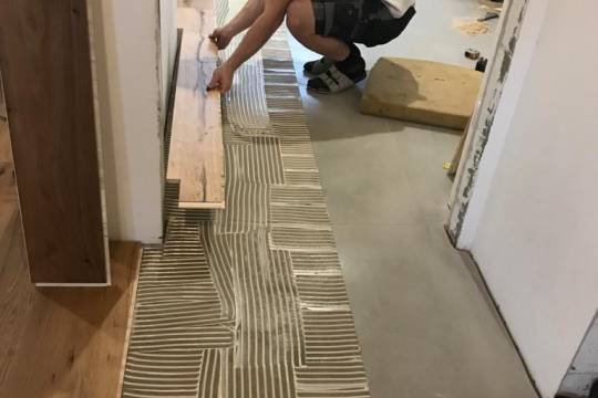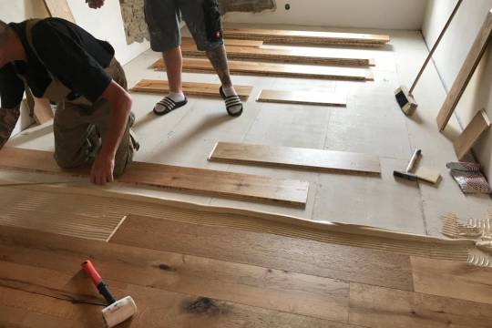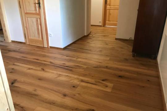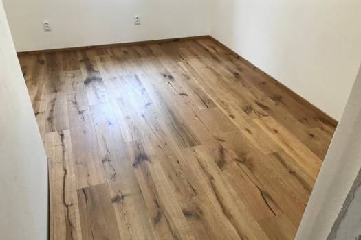 Pokládaným materiálem byla krásná vícervrstvá dubová podlaha s černým sukováním, V spárou, jemným kartáčováním a povrchovou úpravou v oleji. Rozměry lamel tl. 14mm , šíře 190 mm a různé délky. Montáž proběhla celoplošným lepením na silanové lepidlo Bona R 848.