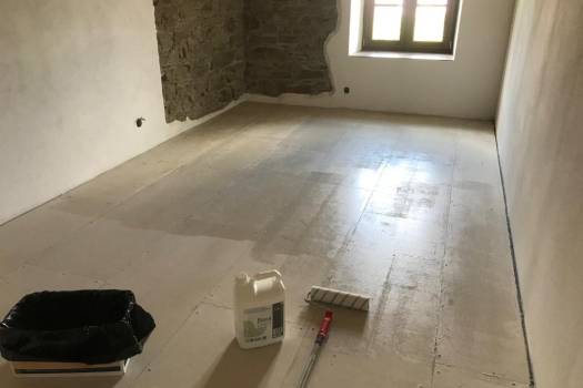 Pro vytvoření pevného a rovného podkladu pro následnou montáž dřevěné podlahy jsme použili sádrovláknité Fermacellové desky o rozměru 1500 x 500 x 25 mm. Jednotlivé desky se spojují lepením v zámcích a částečným šroubováním ve spojích. Betonový potěr, pod kterým byl instalován mokrý podlahový topný systém, jsme vyrovnali samonivelační cementovou hmotou Chemos. Základem pro celoplošné lepení dřevěných lamel byla penetrace savých Fermacelových desek i cementové stěrky penetrací Bona D 501.