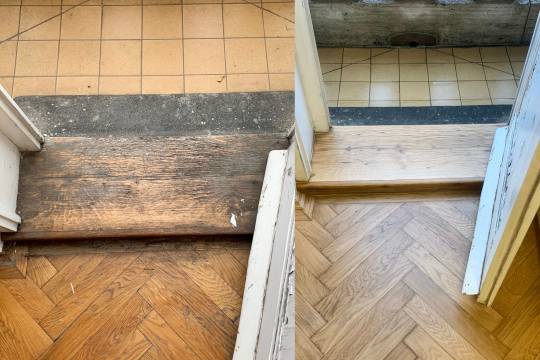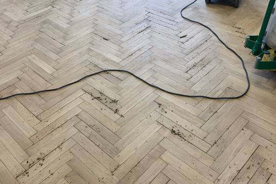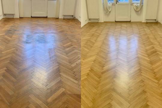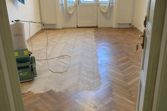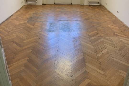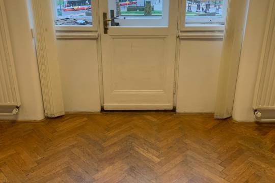 Čekalo nás 12 kanceláří s provozně opotřebovanými parketami. Stále však naštěstí byly v poměrně dobrém stavu, který nevyžadoval stržení parketových dílců a jejich opětovné přilepení k podkladu. Musíme se přiznat, že jsme se na tuto zakázku opravdu "těšili", protože renovace dřevěných podlah nás baví. Je to pořád to podlahářské řemeslo, na které musíte mít perfektní vybavení a hlavně to musíte opravdu umět.